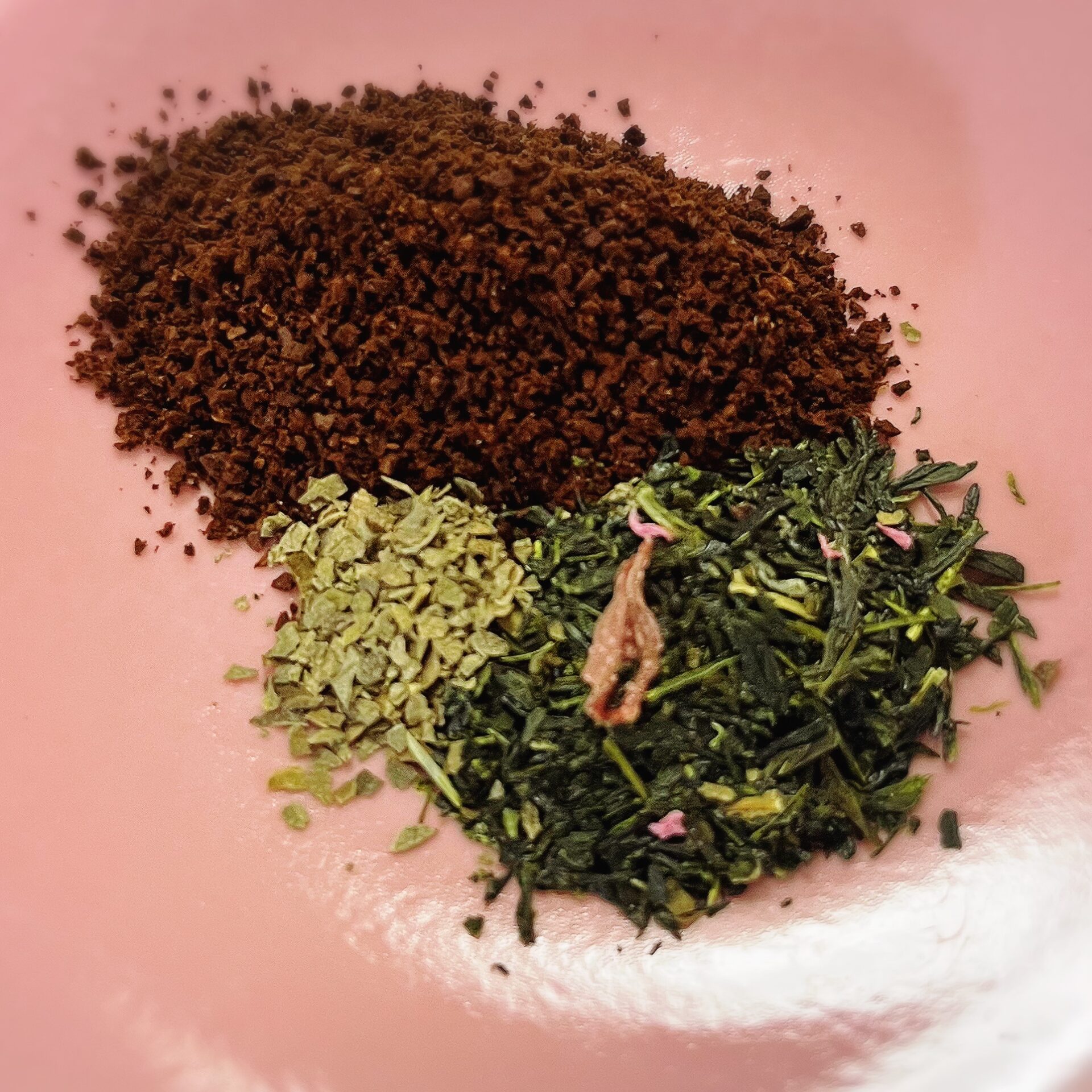 原材料:コーヒー豆(エチオピア)、緑茶(国産)、乾燥桜葉(桜葉、塩)(国産)、桜花(国産)